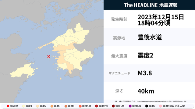 12月15日18時4分頃、豊後水道を震源とするマグニチュード3.8の地震が観測された。最大震度2を観測したのは、愛媛県・高知県。
