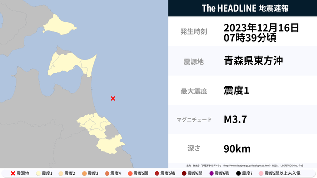 12月16日07時39分頃、青森県東方沖を震源とするマグニチュード3.7の地震が観測された。最大震度1を観測したのは、北海道・青森県など。