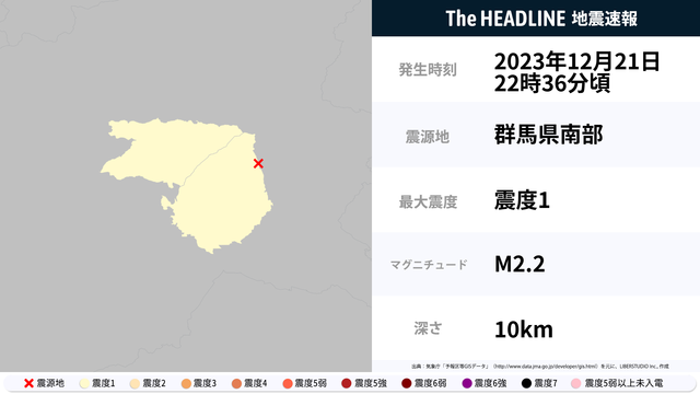 12月21日22時36分頃、群馬県で最大震度1の地震を観測
