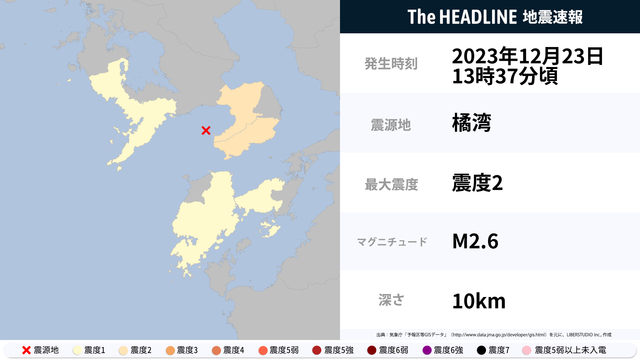 12月23日13時37分頃、橘湾を震源とするマグニチュード2.6の地震が観測された。最大震度2を観測したのは、長崎県。