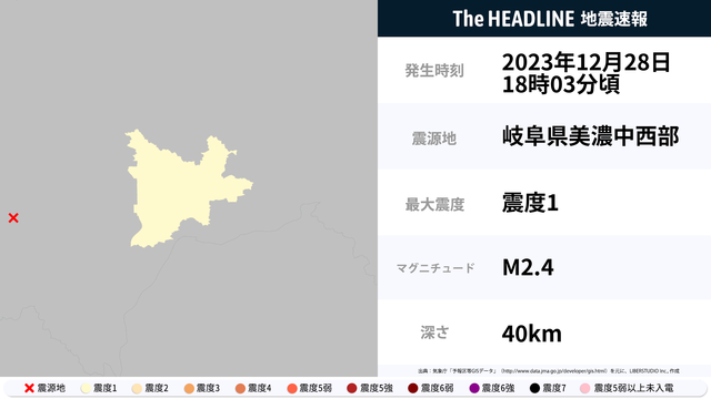 12月28日18時03分頃、岐阜県美濃中西部を震源とするマグニチュード2.4の地震が観測された。最大震度1を観測したのは、岐阜県。