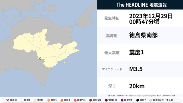 12月29日0時47分頃、徳島県南部を震源とするマグニチュード3.5の地震が観測された。最大震度1を観測したのは、徳島県。
