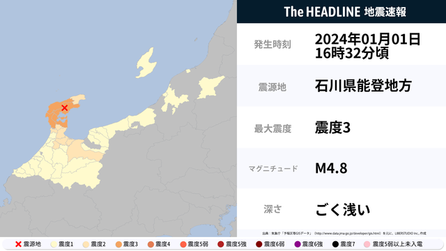 1月1日16時32分頃、石川県で最大震度3の地震を観測