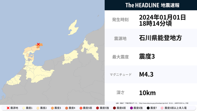 01月01日18時14分頃、石川県能登地方を震源とするマグニチュード4.3の地震が観測された。最大震度3を観測したのは、石川県。