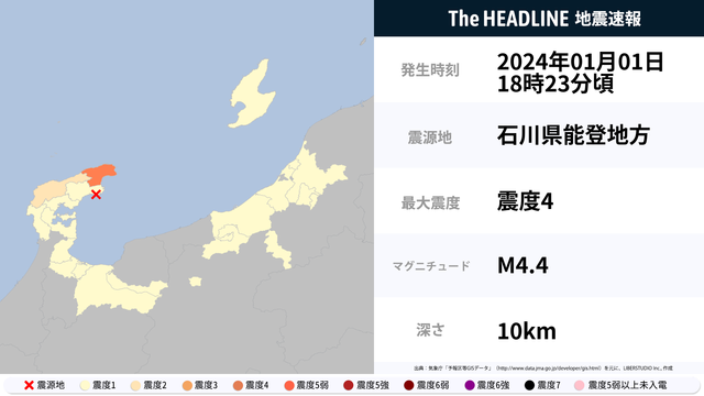 01月01日18時23分頃、石川県能登地方を震源とするマグニチュード4.4の地震が観測された。最大震度4を観測したのは、石川県。