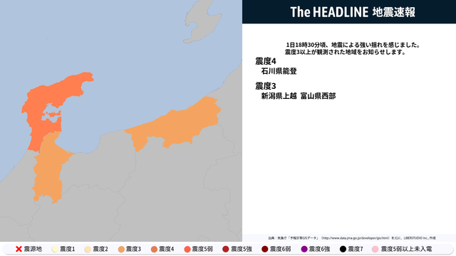 1月1日18時30分頃、石川県能登などで震度3以上の地震を観測した。現時点の発表では、石川県能登で最大震度4、新潟県上越・富山県西部で震度3の観測が発表されている。