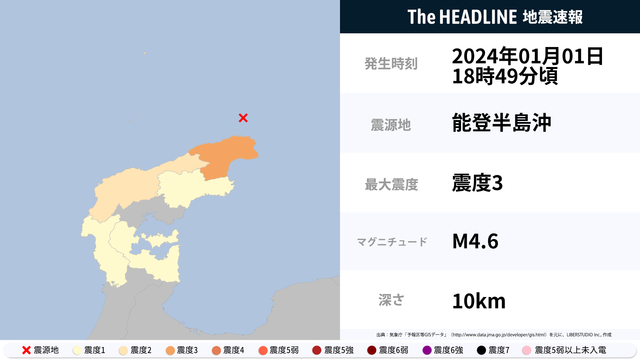 01月01日18時49分頃、能登半島沖を震源とするマグニチュード4.6の地震が観測された。最大震度3を観測したのは、石川県。