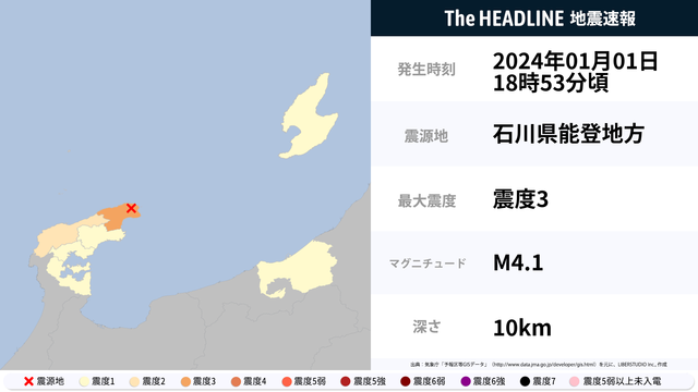 01月01日18時53分頃、石川県能登地方を震源とするマグニチュード4.1の地震が観測された。最大震度3を観測したのは、石川県。
