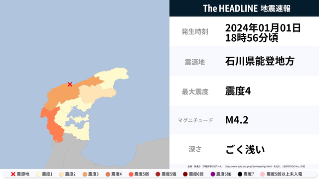 01月01日18時56分頃、石川県能登地方を震源とするマグニチュード4.2の地震が観測された。最大震度4を観測したのは、石川県。