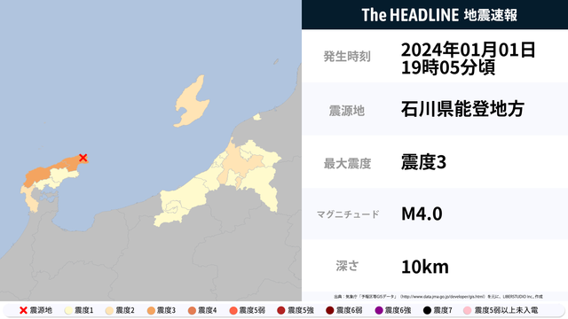 1月1日19時5分頃、石川県で最大震度3の地震を観測