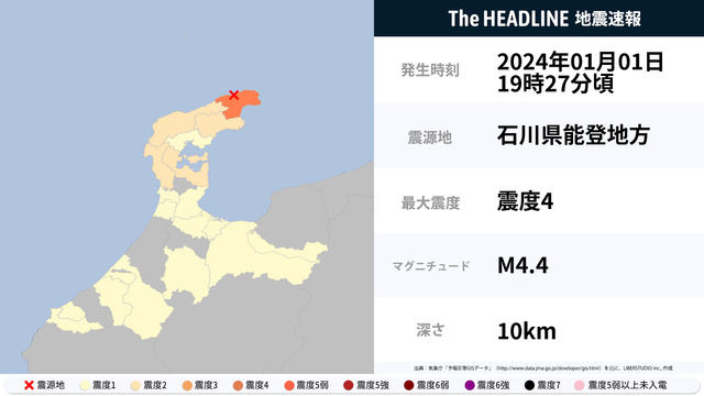 01月01日19時27分頃、石川県能登地方を震源とするマグニチュード4.4の地震が観測された。最大震度4を観測したのは、石川県。