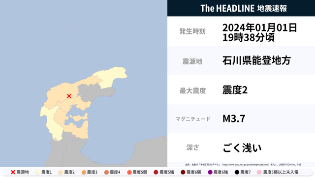 1月1日19時38分頃、石川県で最大震度2の地震を観測