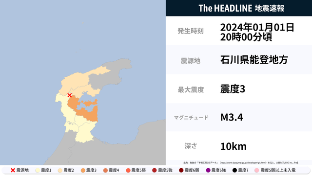 1月1日20時1分頃、石川県で最大震度3の地震を観測