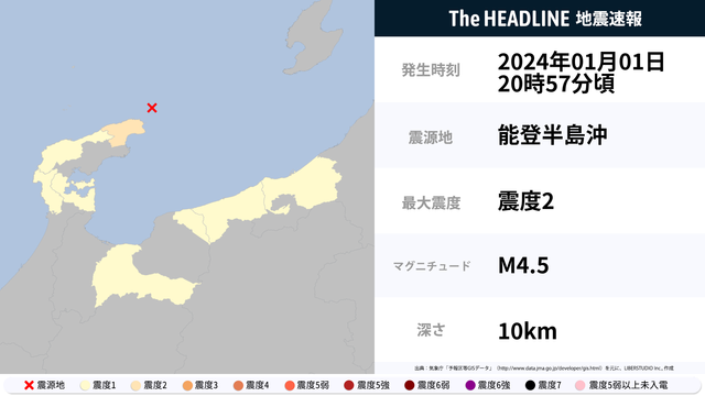 01月01日20時57分頃、能登半島沖を震源とするマグニチュード4.5の地震が観測された。最大震度2を観測したのは、石川県。