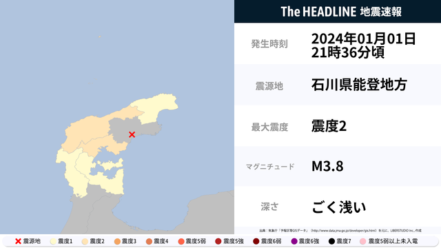 01月01日21時36分頃、石川県能登地方を震源とするマグニチュード3.8の地震が観測された。最大震度2を観測したのは、石川県。