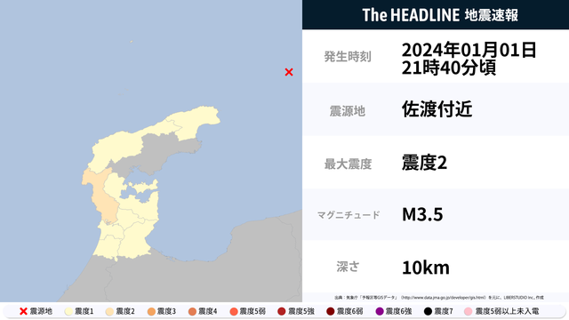01月01日21時40分頃、佐渡付近を震源とするマグニチュード3.5の地震が観測された。最大震度2を観測したのは、石川県。