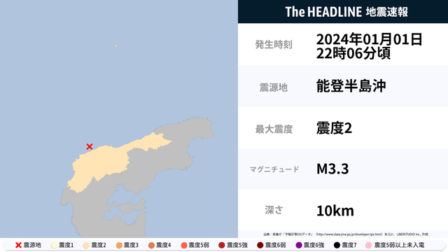01月01日22時06分頃、能登半島沖を震源とするマグニチュード3.3の地震が観測された。最大震度2を観測したのは、石川県。