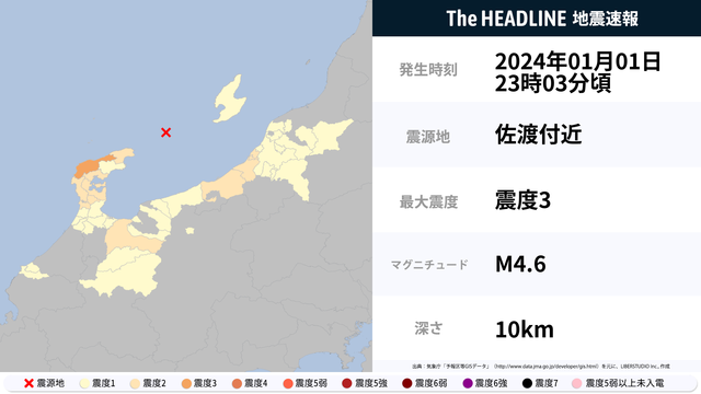 01月01日23時03分頃、佐渡付近を震源とするマグニチュード4.6の地震が観測された。最大震度3を観測したのは、石川県。