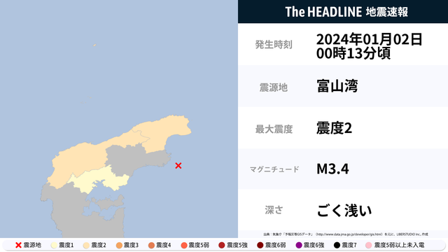 01月02日00時13分頃、富山湾を震源とするマグニチュード3.4の地震が観測された。最大震度2を観測したのは、石川県。