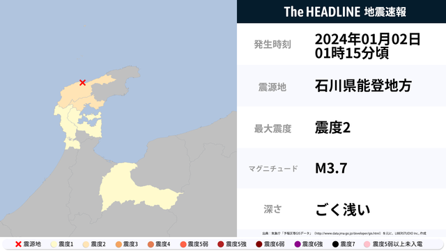 01月02日01時15分頃、石川県能登地方を震源とするマグニチュード3.7の地震が観測された。最大震度2を観測したのは、石川県。