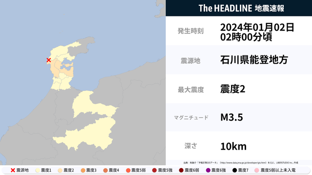 01月02日02時00分頃、石川県能登地方を震源とするマグニチュード3.5の地震が観測された。最大震度2を観測したのは、石川県。