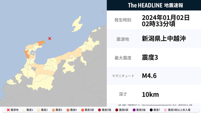01月02日02時33分頃、新潟県上中越沖を震源とするマグニチュード4.6の地震が観測された。最大震度3を観測したのは、石川県。