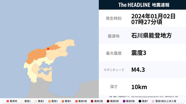 01月02日07時27分頃、石川県能登地方を震源とするマグニチュード4.3の地震が観測された。最大震度3を観測したのは、石川県。