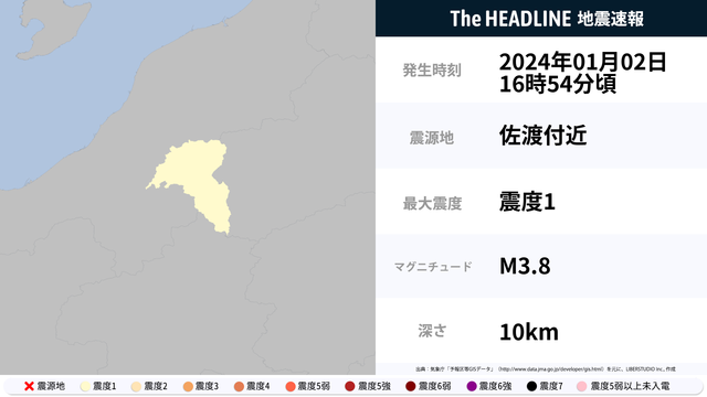 01月02日16時54分頃、佐渡付近を震源とするマグニチュード3.8の地震が観測された。最大震度1を観測したのは、新潟県。