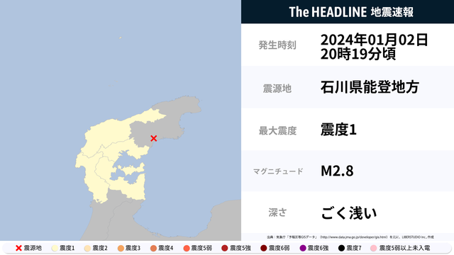 01月02日20時19分頃、石川県能登地方を震源とするマグニチュード2.8の地震が観測された。最大震度1を観測したのは、石川県。