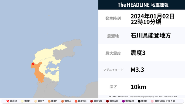 1月2日22時19分頃、石川県で最大震度3の地震を観測