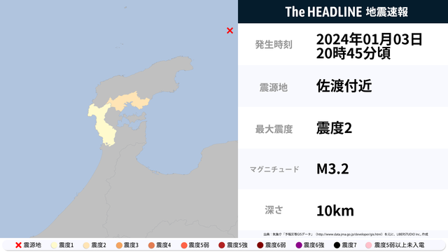 01月03日20時45分頃、佐渡付近を震源とするマグニチュード3.2の地震が観測された。最大震度2を観測したのは、石川県。