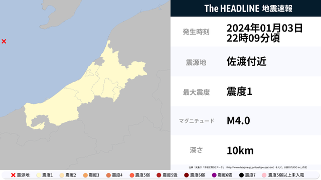 01月03日22時09分頃、佐渡付近を震源とするマグニチュード4.0の地震が観測された。最大震度1を観測したのは、新潟県。