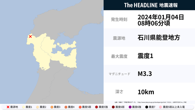 01月04日08時06分頃、石川県能登地方を震源とするマグニチュード3.3の地震が観測された。最大震度1を観測したのは、石川県。