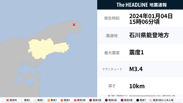 01月04日15時06分頃、石川県能登地方を震源とするマグニチュード3.4の地震が観測された。最大震度1を観測したのは、石川県。