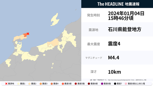 1月4日15時46分頃、石川県で最大震度4の地震を観測
