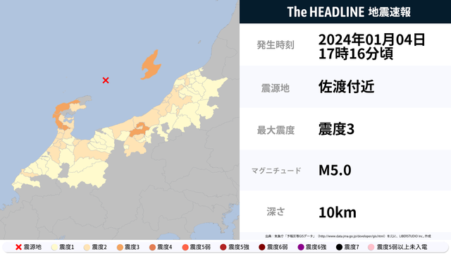 1月4日17時16分頃、佐渡付近を震源とするマグニチュード5.0の地震が観測された。最大震度3を観測したのは、新潟県・石川県。