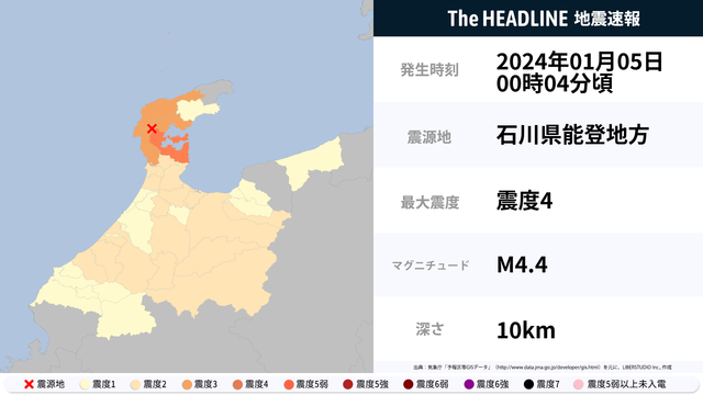 1月5日0時4分頃、石川県で最大震度4の地震を観測