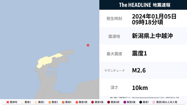 01月05日09時18分頃、新潟県上中越沖を震源とするマグニチュード2.6の地震が観測された。最大震度1を観測したのは、石川県。