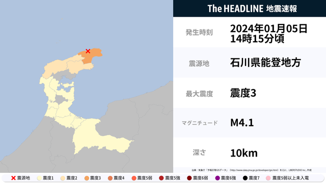 1月5日14時15分頃、石川県能登地方を震源とするマグニチュード4.1の地震が観測された。最大震度3を観測したのは、石川県。
