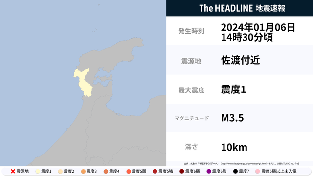 01月06日14時30分頃、佐渡付近を震源とするマグニチュード3.5の地震が観測された。最大震度1を観測したのは、石川県。