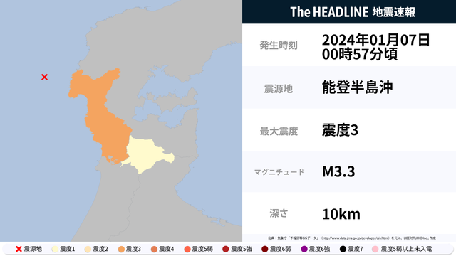 01月07日00時57分頃、能登半島沖を震源とするマグニチュード3.3の地震が観測された。最大震度3を観測したのは、石川県。