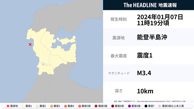 1月7日11時19分頃、能登半島沖を震源とするマグニチュード3.4の地震が観測された。最大震度1を観測したのは、石川県。