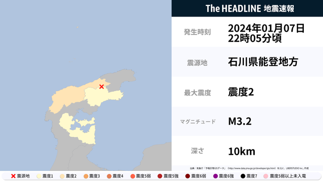 01月07日22時05分頃、石川県能登地方を震源とするマグニチュード3.2の地震が観測された。最大震度2を観測したのは、石川県。
