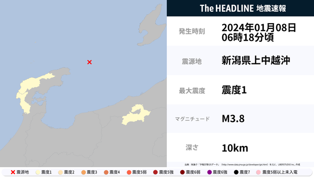 1月8日6時18分頃、新潟県上中越沖を震源とするマグニチュード3.8の地震が観測された。最大震度1を観測したのは、新潟県・石川県。