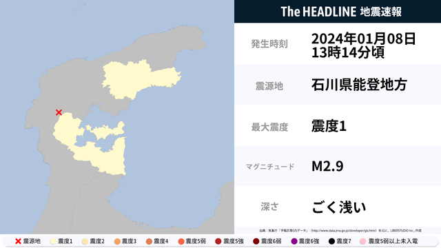 1月8日13時14分頃、石川県能登地方を震源とするマグニチュード2.9の地震が観測された。最大震度1を観測したのは、石川県。