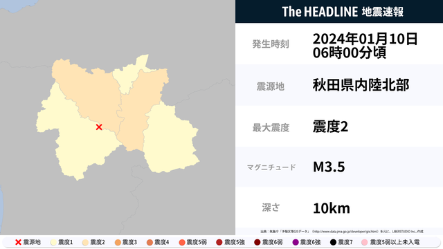 1月10日6時0分頃、秋田県内陸北部を震源とするマグニチュード3.5の地震が観測された。最大震度2を観測したのは、秋田県。