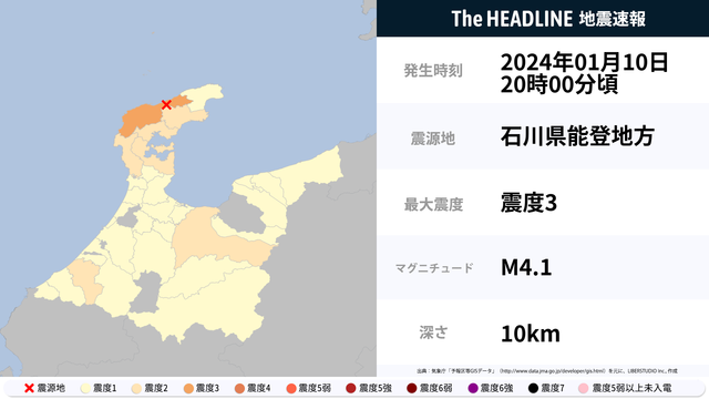 01月10日20時00分頃、石川県能登地方を震源とするマグニチュード4.1の地震が観測された。最大震度3を観測したのは、石川県。
