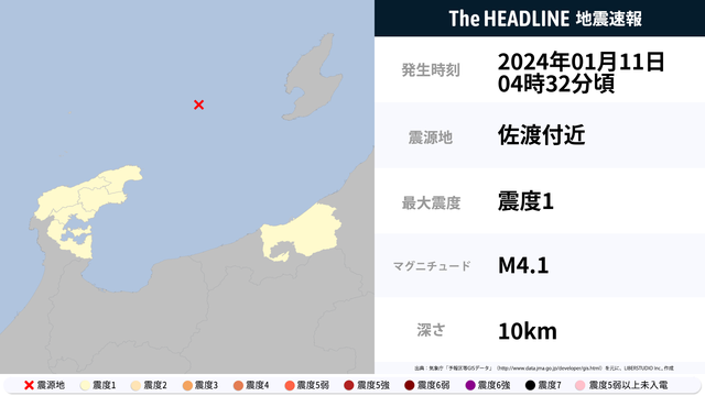 1月11日4時32分頃、佐渡付近を震源とするマグニチュード4.1の地震が観測された。最大震度1を観測したのは、新潟県・石川県。