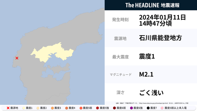 1月11日14時47分頃、石川県能登地方を震源とするマグニチュード2.1の地震が観測された。最大震度1を観測したのは、石川県。