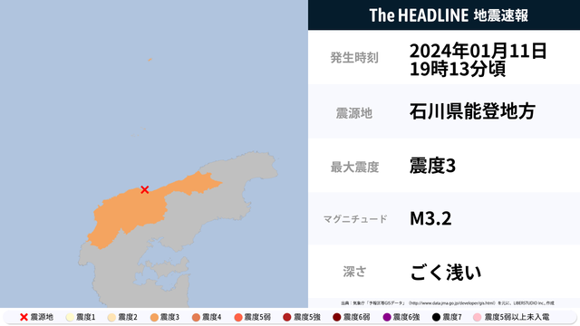 01月11日19時13分頃、石川県能登地方を震源とするマグニチュード3.2の地震が観測された。最大震度3を観測したのは、石川県。